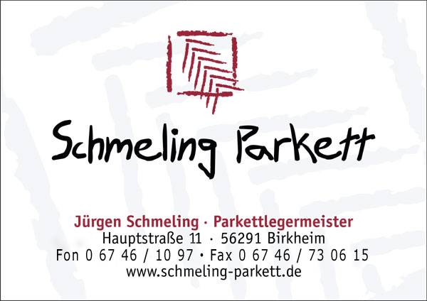 Landhausdielen Fertigparkett Stabparkett ökologische Oberflächen renovieren, sanieren und aufarbeiten von Parkettböden Estrichsanierung Jürgen Schmeling Parkettlegemeister Hauptstraße 11 56291 Birkheim Telefon 0 67 46/10 97 Telefax 0 67 46/73 06 15 E-Mail: info@schmeling-parkett.de |